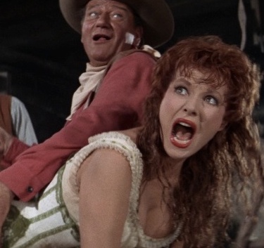 In McLintock, the story centers around Katherine and G.W., while their daughter plays a much nicer Bianca, type character. Katherine’s reason for being angry is not so clear cut as in the play. Supposedly Wayne was trying to make a statement about marital abuse by either spouse. It’s a little hard to see that, but Kate IS verbally and even physically abusive to G.W. because of the lipstick thing. The only way G.W. can get Kate to stop and listen to him is to spank her in front of the whole town at the climax of the movie.